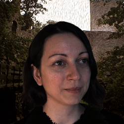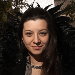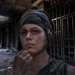 Dobrovolně tu není, ale také se nezdá, že by jí to nějak zvlášť vadilo. Přes pravou tvář se jí táhne poměrně nová ošklivá jizva. Pravé oko má také čerstvě zraněné a není jasné, jak moc (zda vůbec) na něj vidí. Neustále chladně vyhodnocuje okolí. Pohybuje se s lehkostí tanečníka, ač v tom ladném pohybu někdy zazní falešný akord. Ve vlasech má pár stříbrných pramenů, ale nezdá se, že by ji někdo kvůli tomu měl podceňovat, naopak. Celá její osobnost vyjadřuje sebejistotu a vědomí vlastních schopností. O to je zajímavější, že se pořád ohlíží přes rameno. V řeči občas zazní lehký cizí přízvuk. Na krku nosí na řetízku zvláštní minci - občas si s ní hraje, zdánlivě aniž by si to uvědomovala.